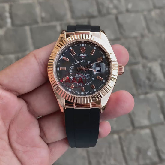 Rose Gold Black Dial Rol__ex Sky Dweller Watch For Men